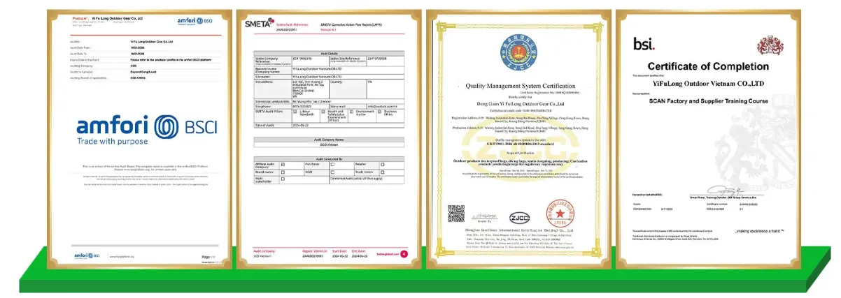 Ние последователно получихме редица авторитетни сертификати, включително ISO 9001 за управление на качеството, BSCI/SMETA за социална отговорност и Higg Index за екологична устойчивост.